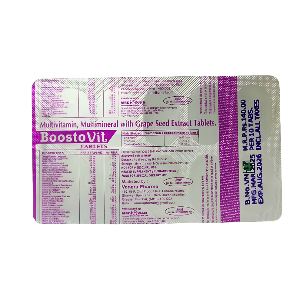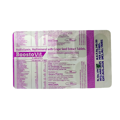 Bosstovit Tablet have several different nutritional and health benefits. The major active components of the tablet are minerals such as Calcium, Phosphorus, Magnesium and other essential minerals. It also contains vitamins including A, D3, B1, B2, Folic acid, Biotin, Ascorbic acid etc. It also contains the some amount of natural antioxidants such as Lycopene and Lutein. It is known to be good for the health of the heart as it has various multivitamins such as B12, B6, and folic acid. Vitamins B complex which have a major role in carbohydrate metabolism and also aid in assimilation of proteins, fats into energy. Vitamin C and E, iron, ginseng and selenium enhance the immune system. It fights with free radicals, reduces oxidative stress and improves immunity & is an ideal combination for Cardio-diabetic patients, fatigue and weakness.