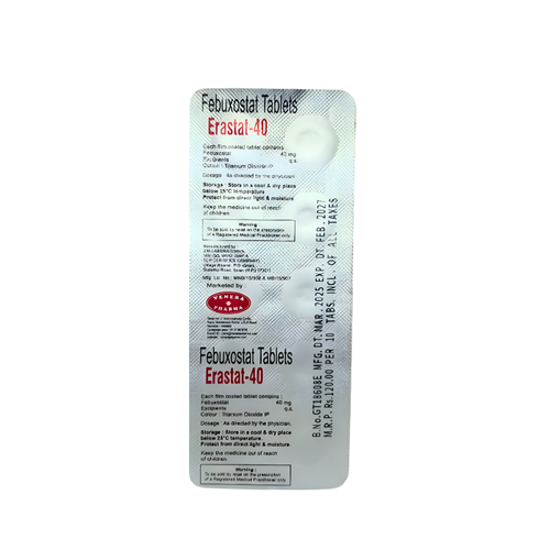 Erastat 40 Tablet is used to treat and prevent gout & Hyperuricemia. Gout happens when there is too much uric acid in your body and it forms into crystals that can appear around your joints leading to painful and swollen joints. This medicine helps to keep uric acid levels in control limits.