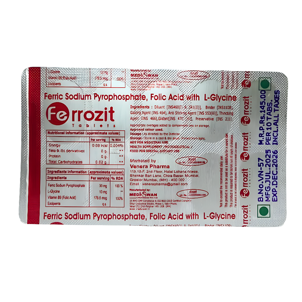 Ferrozit Tablet is a health supplement that contains iron which is an essential element for blood production and plays a vital role in red blood cells formation & folic acid which helps in tissue growth and cell function.