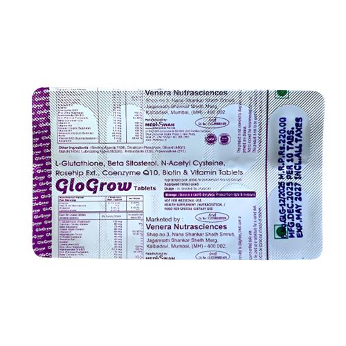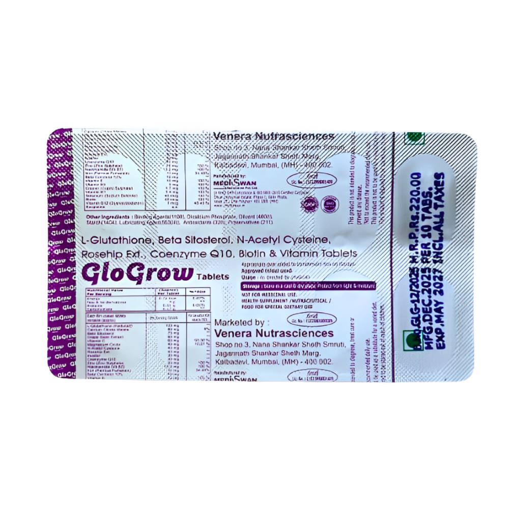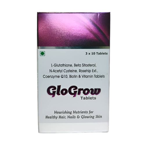 Glogrow tablet is a supplement used for strengthening hair follicles thereby preventing hair loss and also stimulates hair growth. It also brightens skin with glow and radiance. It also strengthens nails.