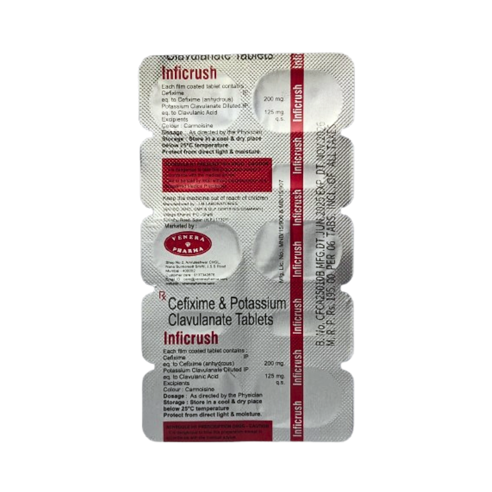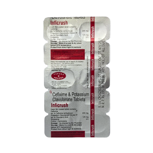 Inficrush Tablet helps treat infections that are caused by bacteria. It contains two medicines, Cefixime, and Clavulanic acid. Cefixime stops the growth of infection-causing bacteria. Clavulanic Acid enhances the activity of Cefixime against the bacteria as well as reduces resistance of the bacteria to the antibiotic.