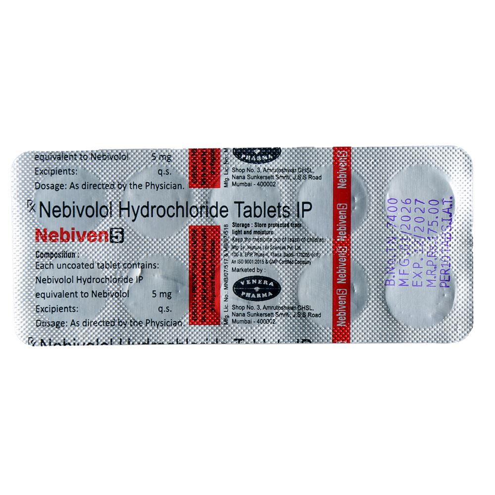 Nebiven 5 tablet belongs to a group of medicine called long-acting beta-blocker. It works by blocking the effects of some chemicals on your heart and blood vessels. It slows down your heart rate and helps the heart beat with less force. This lowers your blood pressure and helps in reducing your risk of having a stroke, a heart attack, other heart problems, or kidney problems in the future.