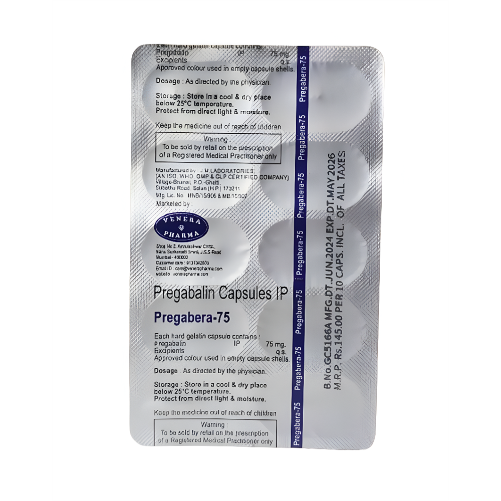 Pregabera 75 Capsule is used to treat long-lasting (chronic) pain caused by nerve damage due to diabetes(Diabetic neuropathy), shingles, or spinal cord injury. It reduces pain and its associated symptoms such as mood changes, sleep problems, and tiredness. It is thought to work by interfering with pain signals that travel through the damaged nerves and the brain. Taking this medicine regularly will improve your physical and social functioning and overall quality of life.