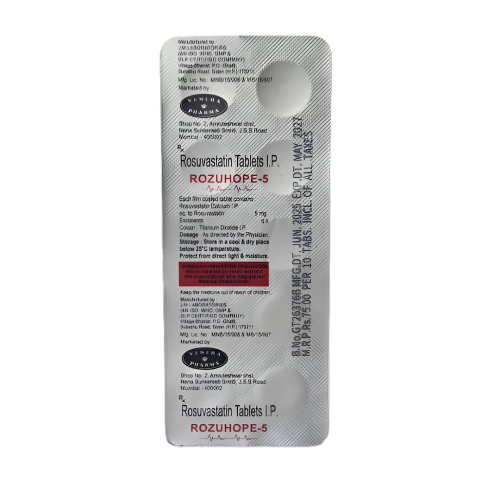 Rozuhope-5 Tablet belongs to a group of medicines called statins. It works by reducing the amount of “bad” cholesterol and raising the amount of “good” cholesterol in your blood. Lowering the amount of cholesterol reduces the chances of heart diseases and helps you remain healthier for longer. Take it regularly and make appropriate lifestyle changes (such as eating healthy and staying active) to maximize the effectiveness of this medicine. It prevents heart attack and stroke High levels of cholesterol can cause your blood vessels to narrow (atherosclerosis) and put you at risk of having a stroke or heart disease.
