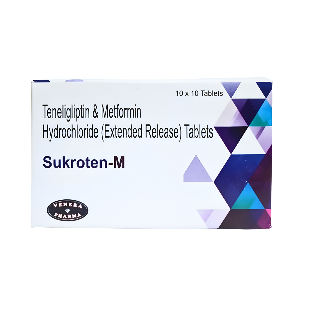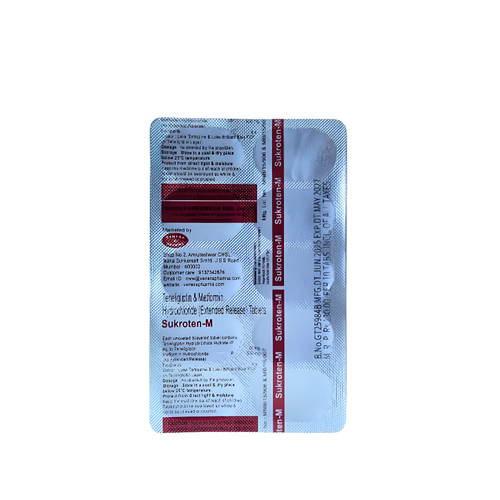 Sukroten-M Tablet is a combination of two medicines that work together in different ways to lower your blood glucose levels. Metformin works by glucose production in the liver and decreasing its absorption from the intestines, while Teneligliptin increases insulin levels and lowers glucagon levels.