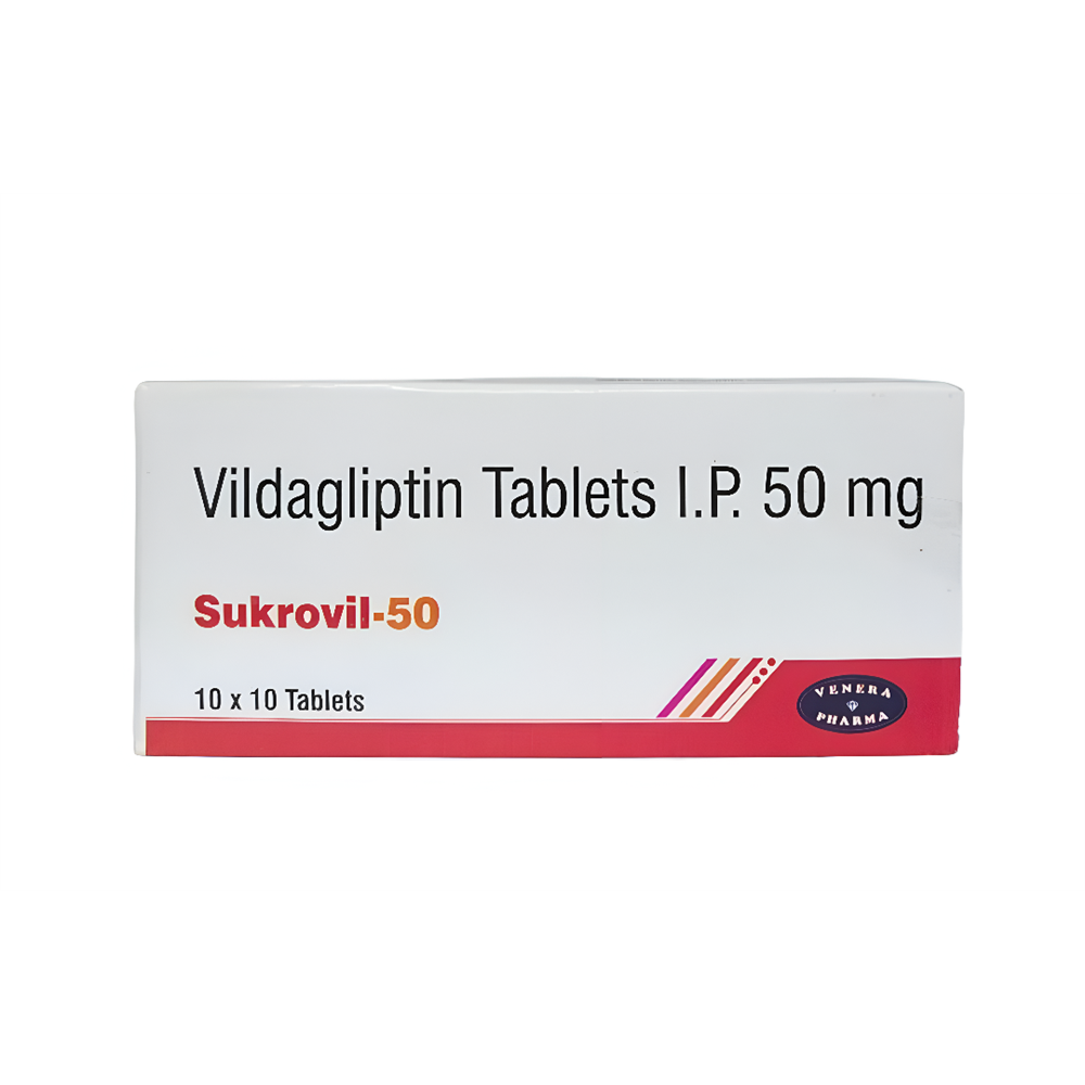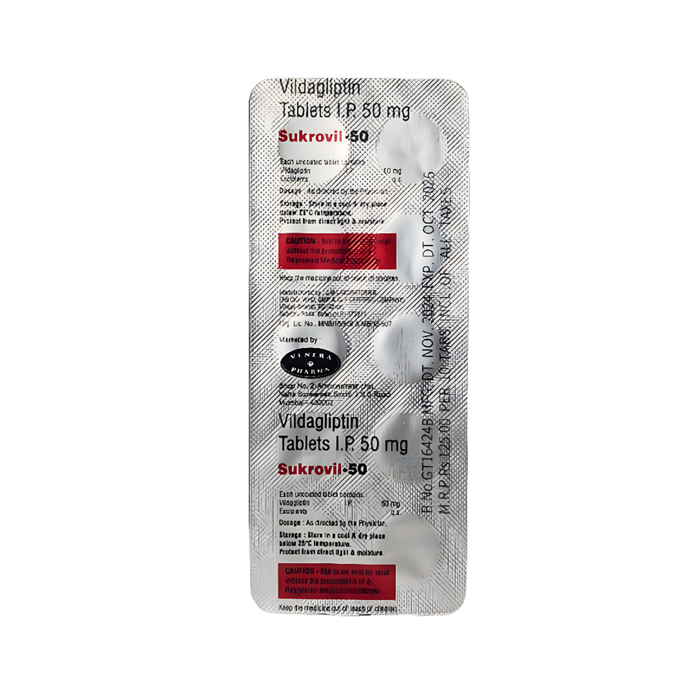 Sukrovil-50mg Tablet belongs to a group of medicines called DPP-4 inhibitors. It works by helping to increase the amount of insulin your body produces after a meal and to stop your body from releasing too much glucose (sugar) into your blood. This way it lowers the blood glucose levels in your body. Lowering blood glucose levels is an essential part of managing diabetes. If you can control the level you will reduce the risk of getting any of the serious complications of diabetes such as kidney damage, eye damage, nerve problems, and loss of limbs. Proper control of diabetes can also reduce the risk of heart disease and stroke. Taking this medicine regularly along with a proper program of diet and exercise will help you live a normal, healthy life. You should keep using it for as long as it is prescribed because it is protecting your future health.