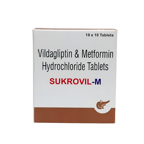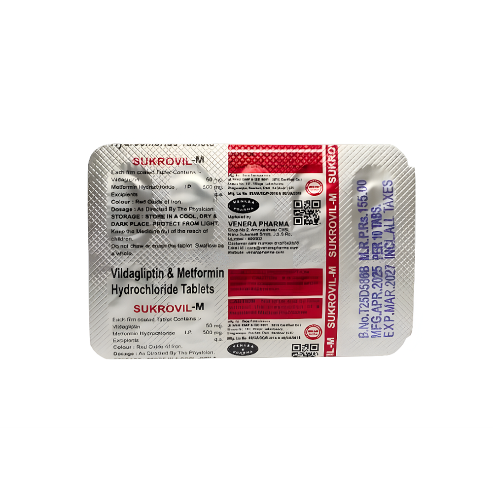 Tab Sukrovil-M Tablet is a combination of two medicines that work together in different ways to lower your blood glucose levels. Metformin works by glucose production in the liver and decreasing its absorption from the intestines, while Vildagliptin increases insulin levels and lowers glucagon levels.