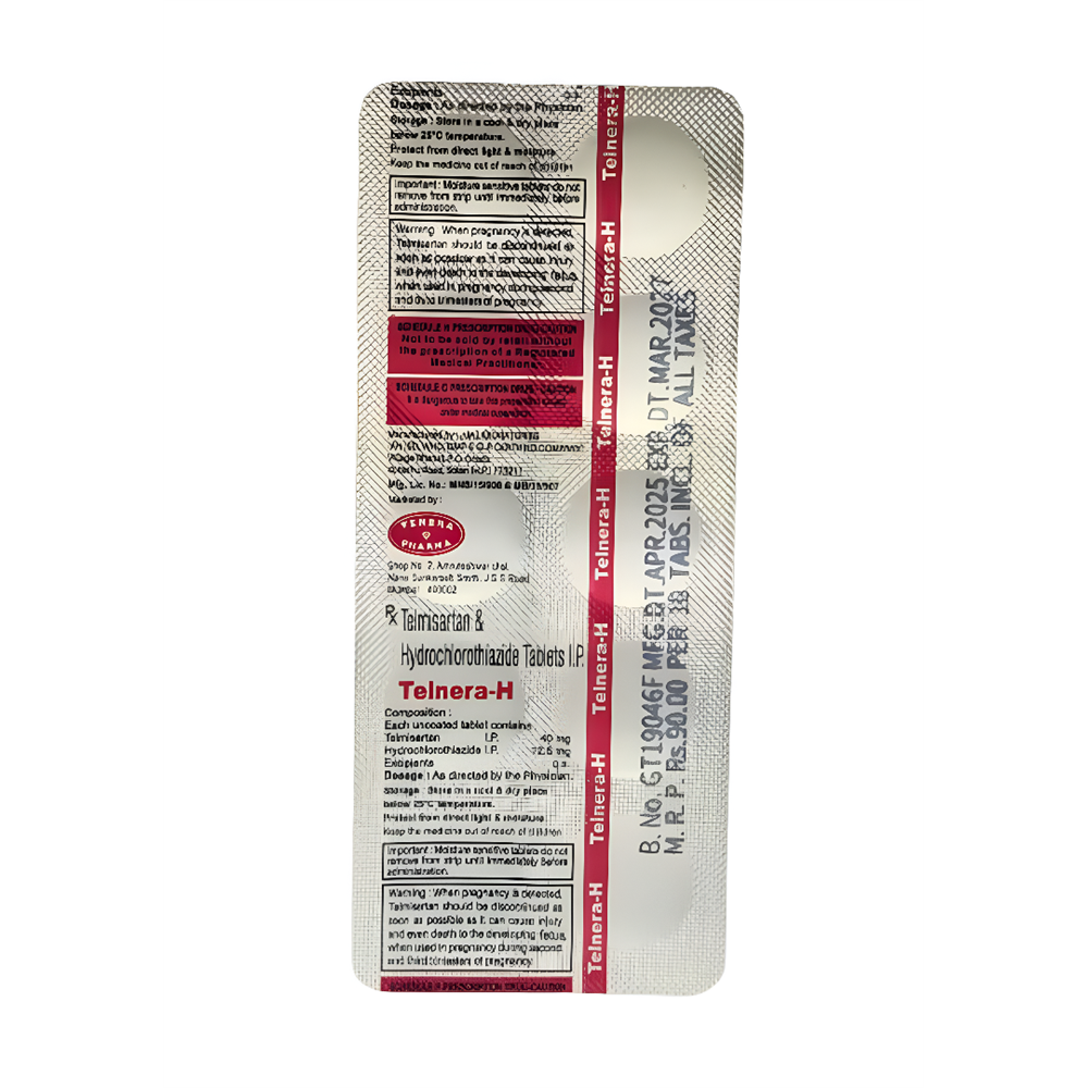 Telnera H Tablet is a combination of two medicines namely telmisartan and hydrochlorothiazide. It is generally used when one medicine alone is not controlling your blood pressure effectively. Telmisartan works by relaxing and widening your blood vessels so your blood can flow more easily. This will lower your blood pressure. Hydrochlorothiazide is known as a diuretic (water pill) which increases urine output thereby lowering blood pressure. If your blood pressure is controlled you are less at risk of having a heart attack, stroke, or kidney problems.