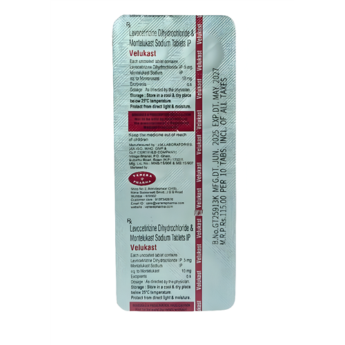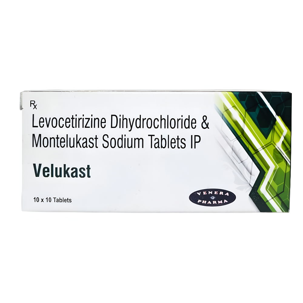 Velukast Tablet is a combination medicine that provides relief from symptoms such as blocked or runny nose, sneezing and itchy or watery eyes.