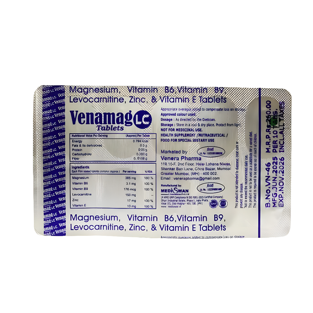 Venamag-LC Tablet is used in the treatment of muscle cramps. It enhances muscle strength and recovery, thereby boosting muscle function.