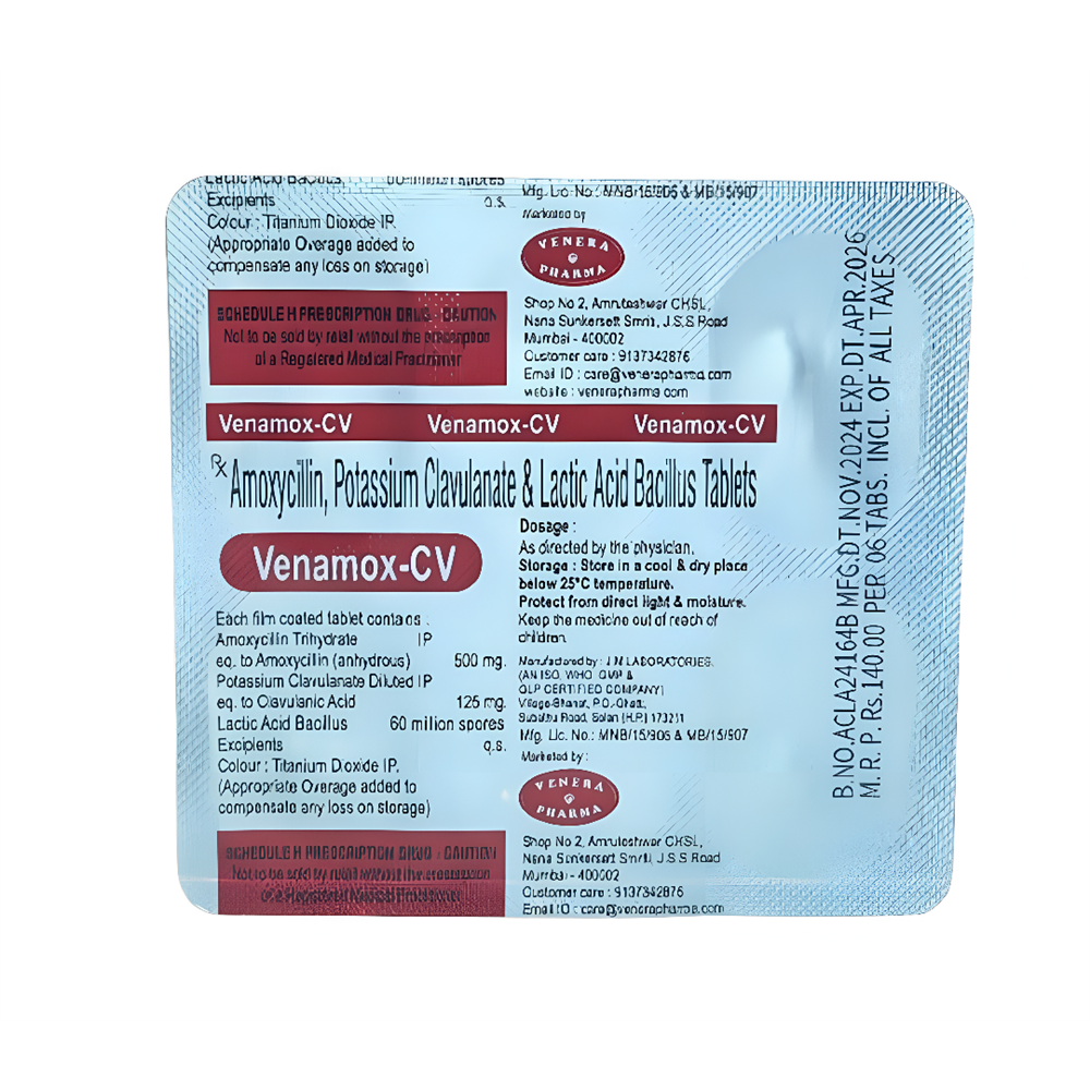 Venamox-CV tablet is used to treat and control different infections caused by bacteria, such as dental infection, sinusitis, pneumonia, ear infections, bronchitis, urinary tract infections and infections of the skin. It works by killing the bacteria causing infections in the body.