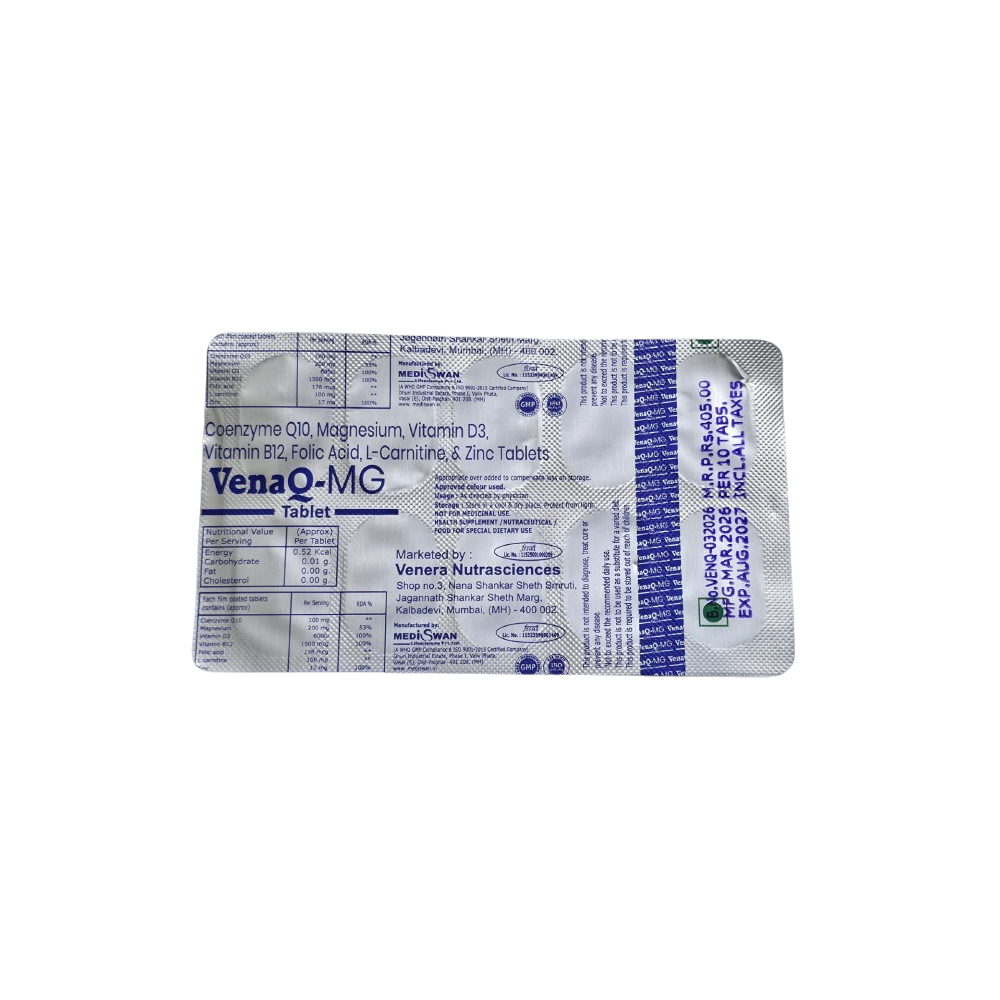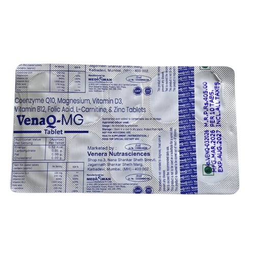 VenaQ-Mg tablet is used for providing potent antioxidants, essential vitamins, and amino acids. It may promote heart health, boost energy levels and support immune function. Methylcobalamin supports brain and nerve health. Magnesium & L-Carnitine helps in muscle recovery from muscle cramps and improve physical performance.